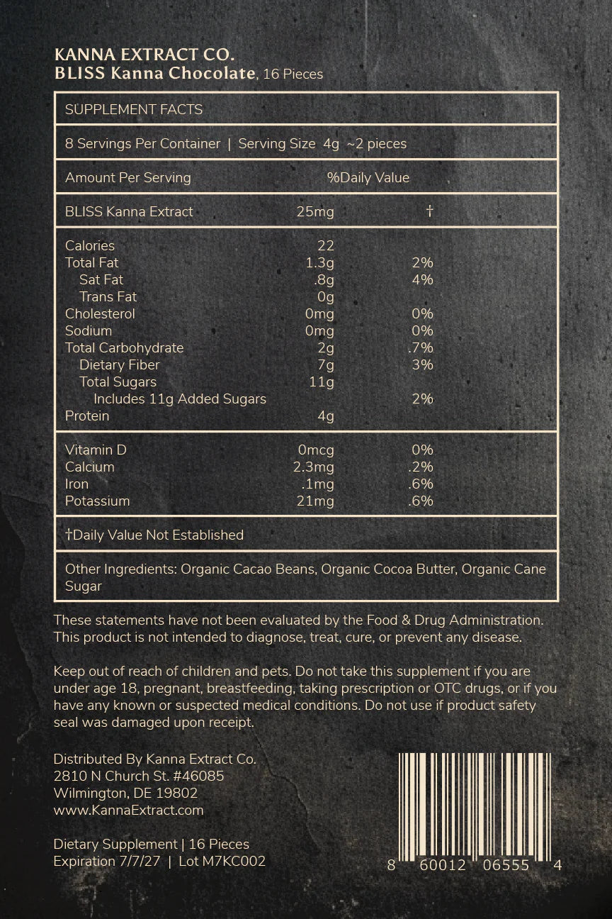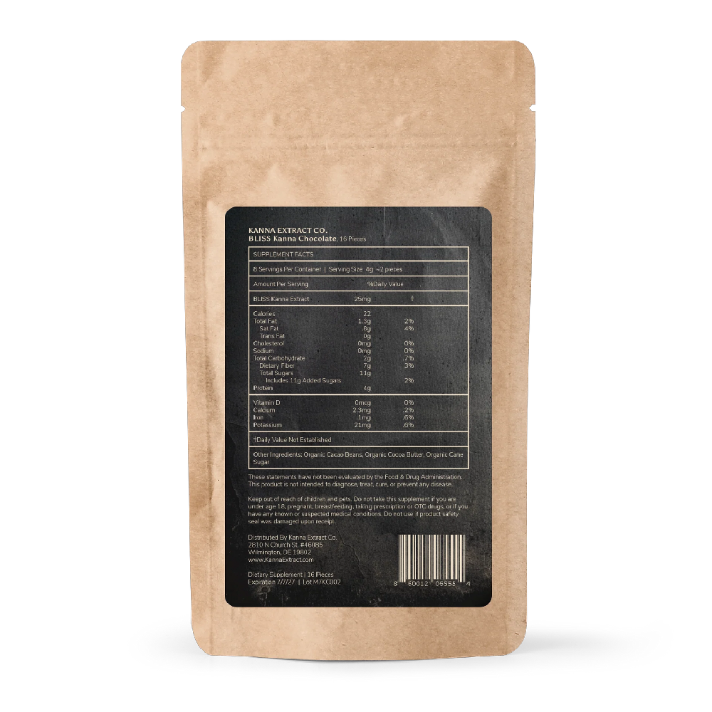 Contents include 32 grams of chocolate (16 pieces), infused with 200mg of BLISS Kanna Extract (25 servings), packed inside of a 2oz pouch.