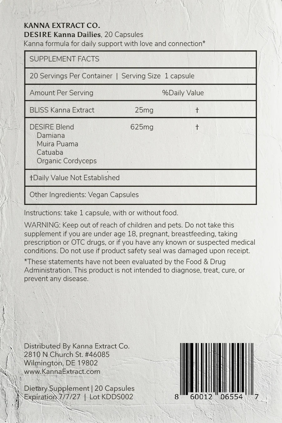 Contents include 20 vegan capsules, each filled with 25mg of BLISS Kanna Extract + 625mg blend of Damiana, Catuaba, Muira Puama, and Organic Cordyceps Extract, packed inside of a 2oz pouch.